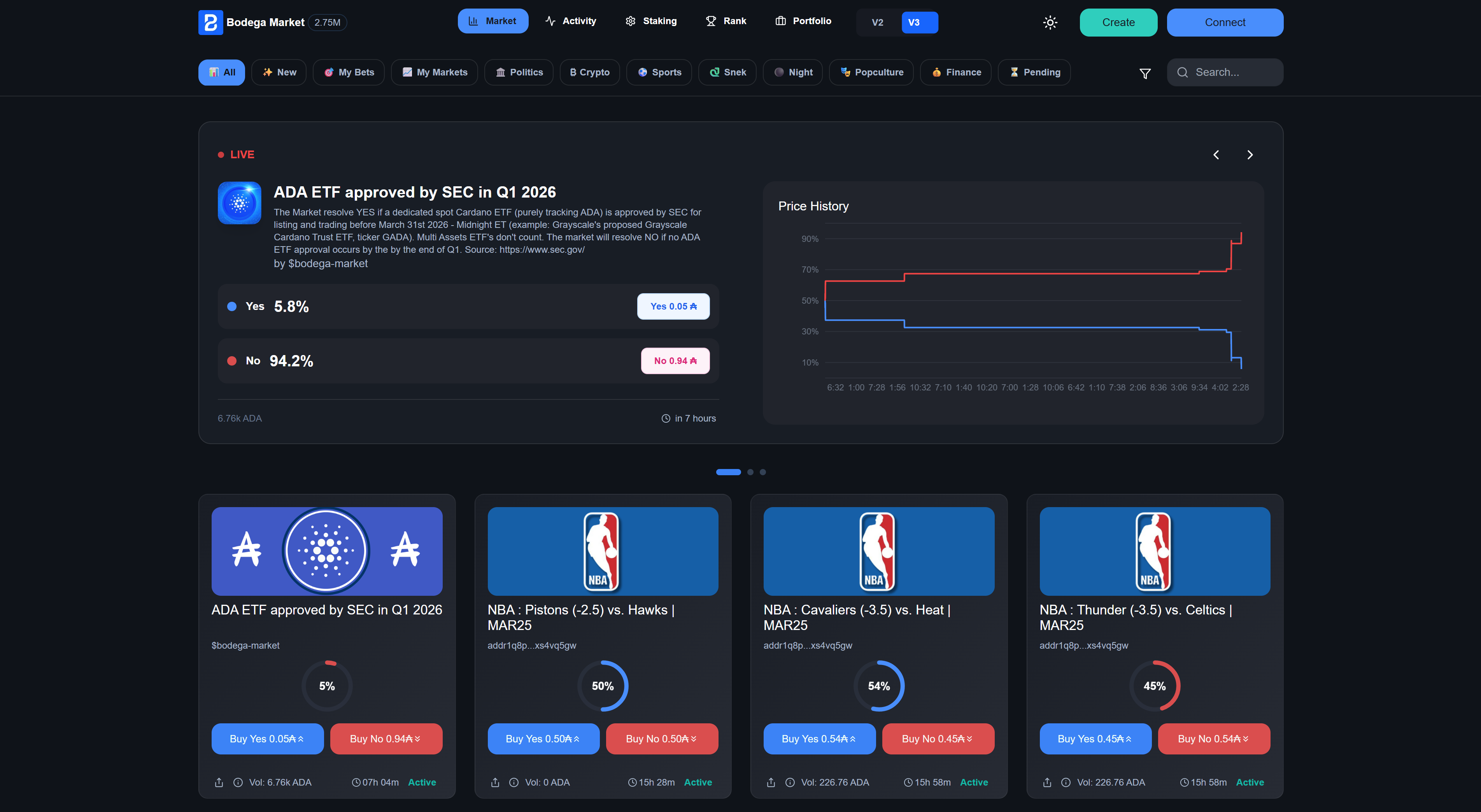 const project = {name: 'Bodega Market',role: Front-End Engineer,description: Front-end engineer on a decentralised prediction market built on Cardano. Built the full trading UI including market creation, position management, and settlement flows. Integrated on-chain data with a clean, responsive interface optimised for both desktop and mobile traders.,};Live on Cardano mainnet · Decentralised prediction market