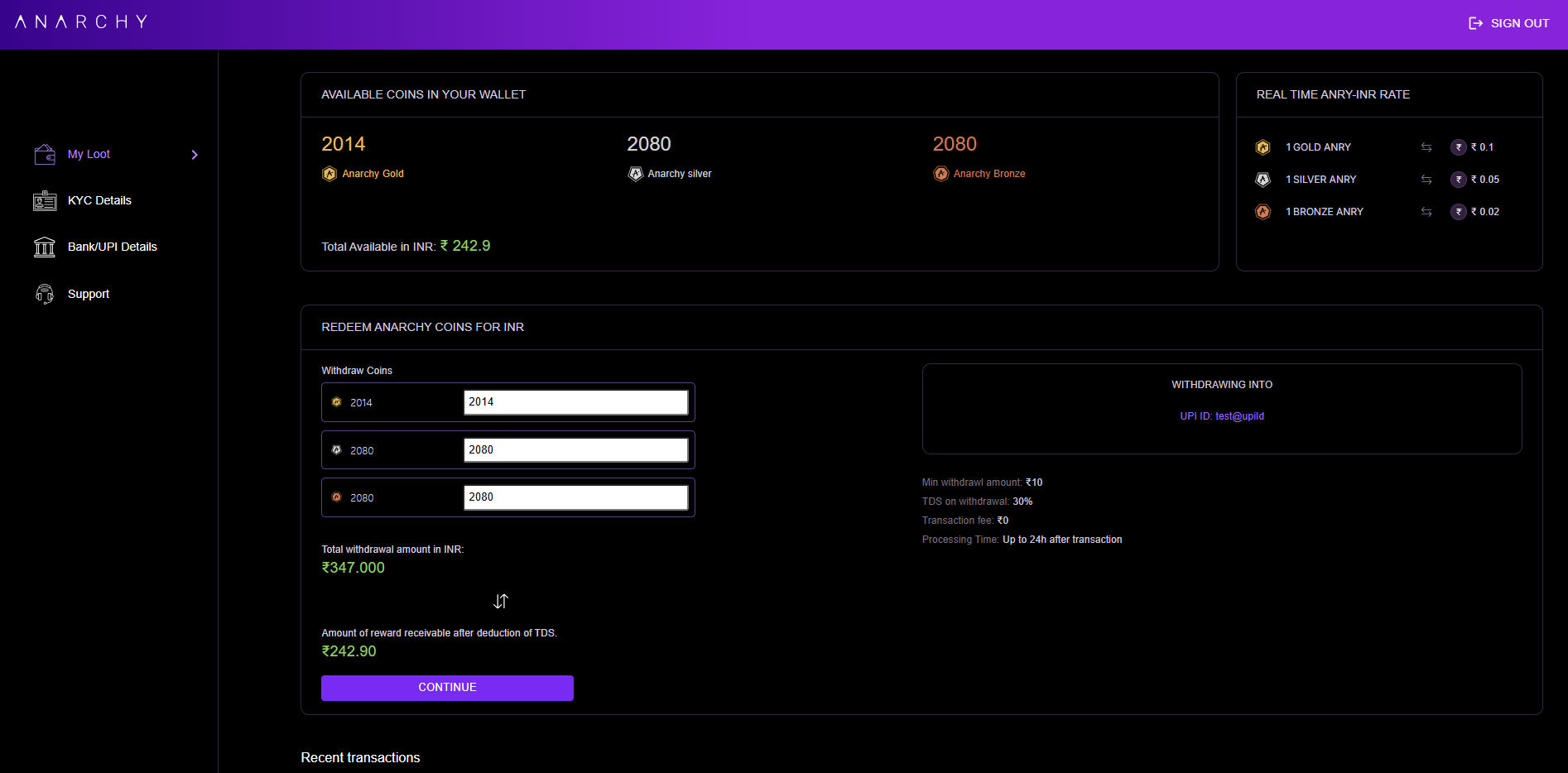 const project = {name: 'Coin Redeeming Web App',role: Fullstack Developer,description: I was responsible for designing, developing, and deploying a Game Coin Redeeming Web Application that allows users to redeem, and manage in-game coins or rewards. The app provides a seamless experience for users to track their coin balance, redeem rewards, and view transaction history, while also offering a section for managing KYC details and bank details.,};Coin Redeeming Web App · CRUD API and functionality